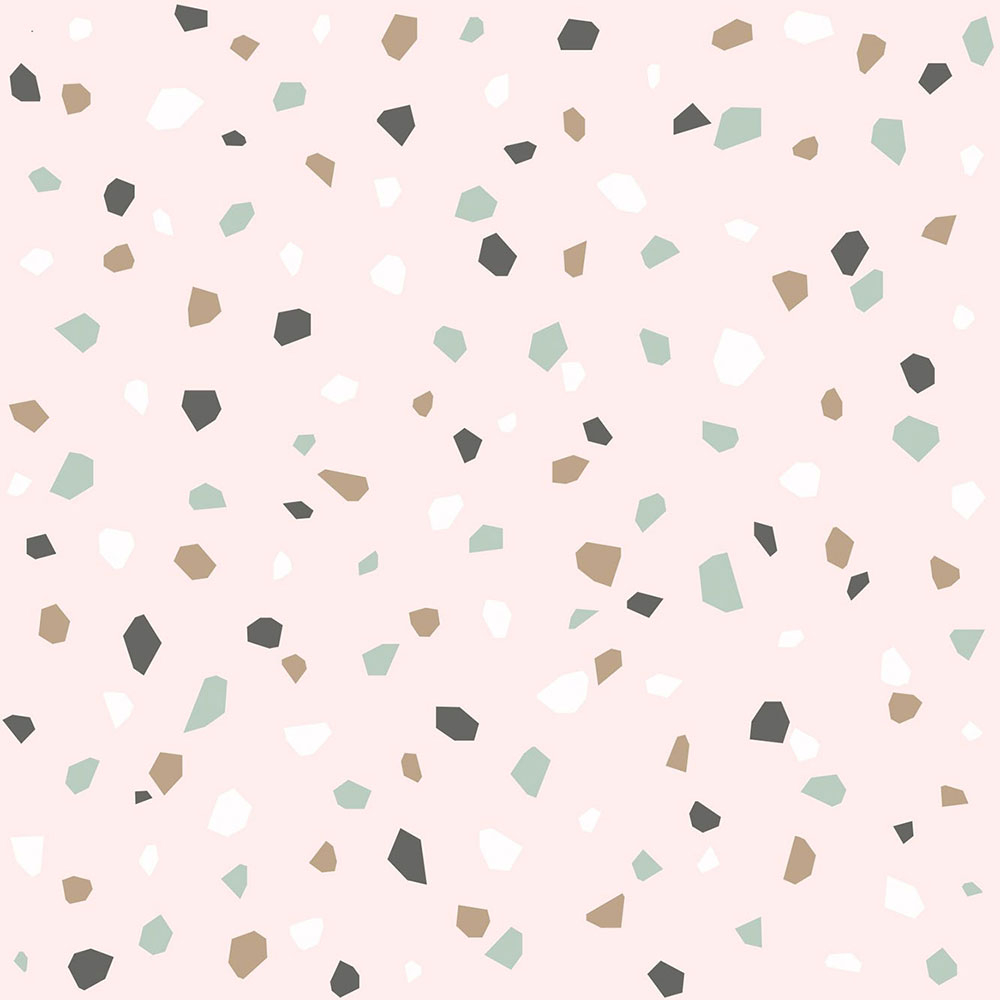 Růžová tapeta na zeď se vzorem barevných kamínků. Návaznost vzoru je 26,5 cm, podklad tapety vlies, povrch papír.
