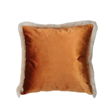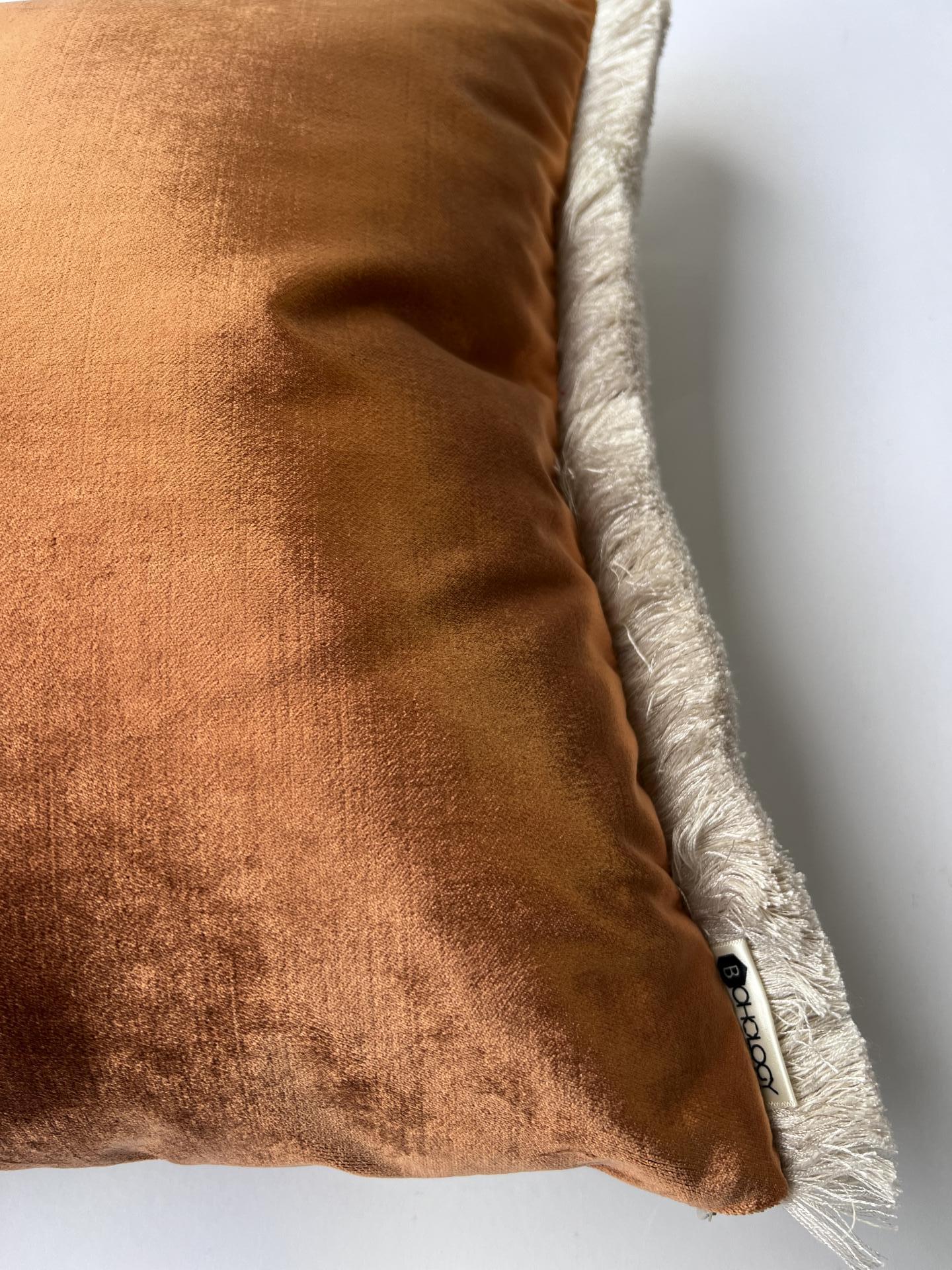 Dekorační povlak na polštář v měděné barvě, vyrobený z kvalitního sametu Élitis. Povlak je opatřený třásněmi. Jistě se stane ozdobou vašeho bydlení, ať už v obývacím pokoji, ložnici nebo terase.