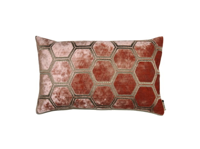 Dekorační povlak na polštář s motivem hexagon, odstin Coral. Je vyroben z nejkvalitnějších látek předních světových výrobců a jistě se stane ozdobou vašeho bydlení, ať už v obývacím pokoji, ložnici nebo terase.