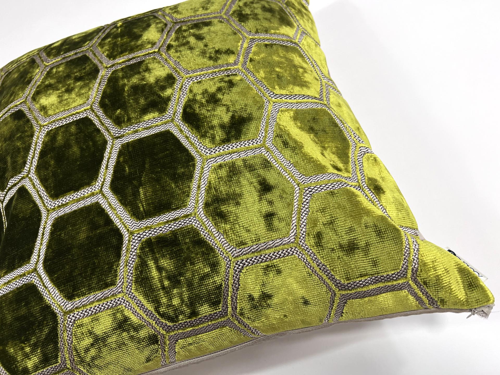 Dekorační povlak na polštář se vzorem hexagon, zelený odstín. Je vyroben z nejkvalitnějších látek předních světových výrobců a jistě se stane ozdobou vašeho bydlení, ať už v obývacím pokoji, ložnici nebo terase.
