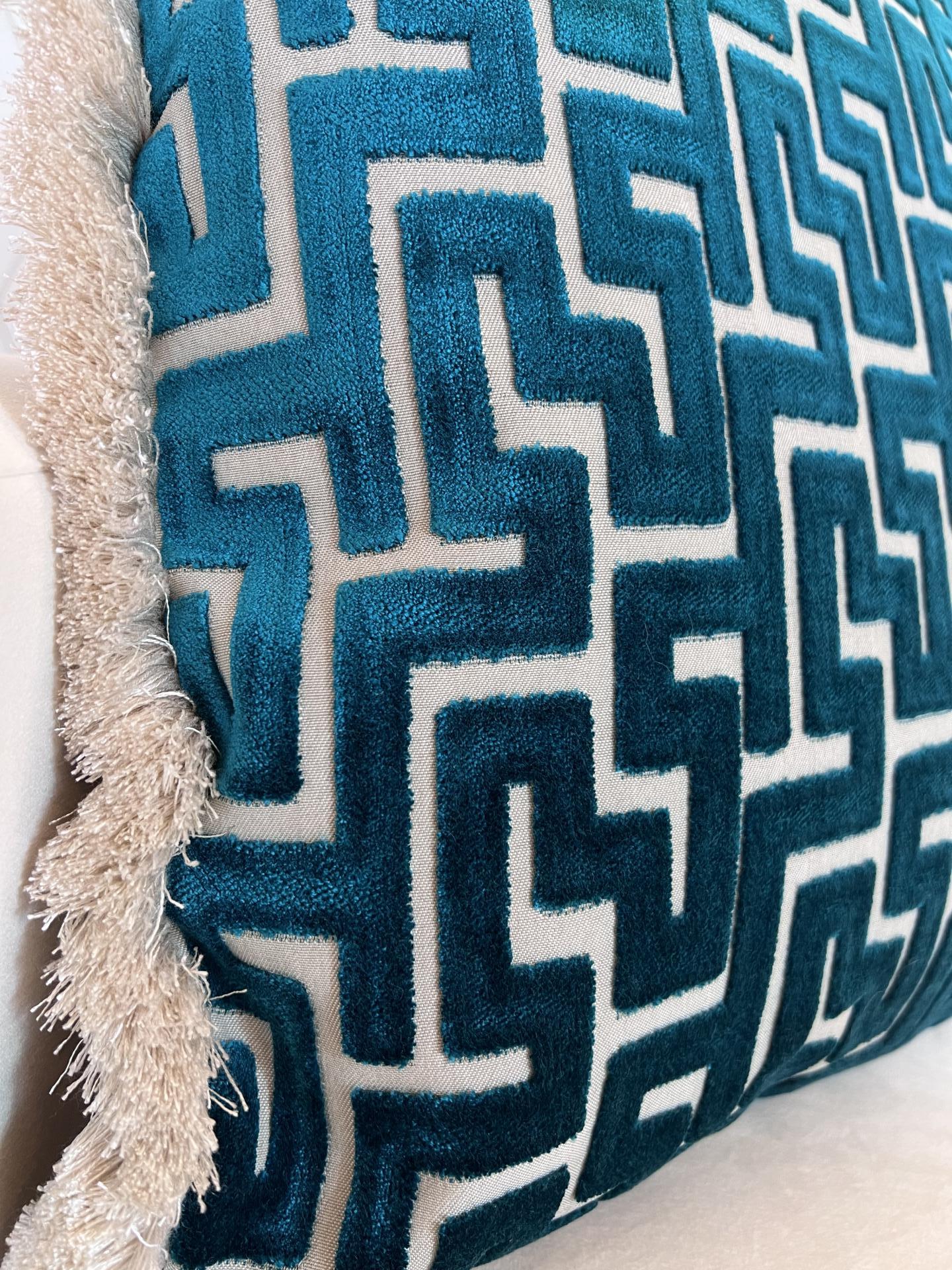 Dekorační povlak na polštář v zelené barvě, s třásněmi. Je vyroben z nejkvalitnějších látek předních světových výrobců a jistě se stane ozdobou vašeho bydlení, ať už v obývacím pokoji, ložnici nebo terase.