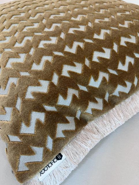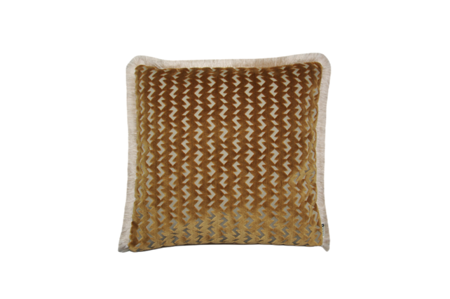 Dekorační povlak na polštář ve zlaté barvě s třásněmi. Je vyroben z nejkvalitnějších látek předních světových výrobců a jistě se stane ozdobou vašeho bydlení, ať už v obývacím pokoji, ložnici nebo terase.